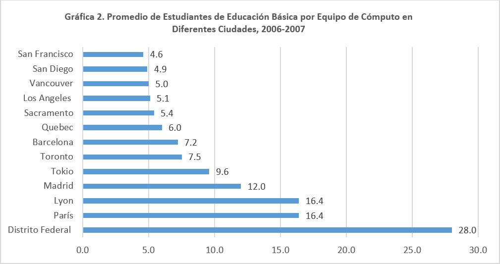 En particular, al comparar a la Ciudad de México con otras importantes ciudades del mundo en relación al número promedio de estudiantes de educación básica por cada computadora, se observa que existe una brecha notoria. En la Gráfica 2 se puede ver que las Ciudades con mejores condiciones de conectividad en 2006-2007 eran San Francisco (4.6 estudiantes promedio por computadora), San Diego (4.9 estudiantes por computadora) y los Ángeles (5.1 estudiantes por computadora) mientras que, en la Ciudad de México, el promedio era de 28 estudiantes por equipo.