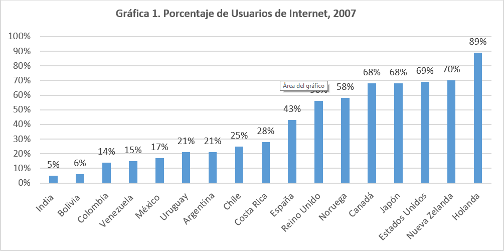 No obstante lo anterior, hasta muy recientemente dicha conectividad no había sido instaurada en todas las escuelas de educación básica ni se había generalizado en los países en vía de desarrollo. La gráfica 1 muestra el porcentaje de usuarios de internet en el 2007 en diferentes países del mundo. En esta distribución México representa un 17% de usuarios, lo cual en comparación con otros países en un porcentaje bajo tomando en cuenta el tamaño de la población mexicana, lo que muestra la escasa conectividad que existía en el país en ese año.